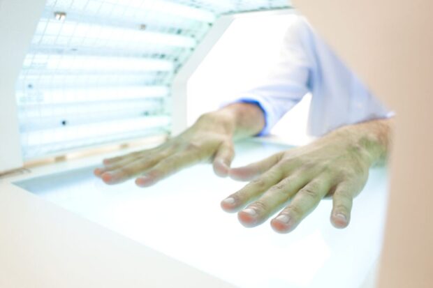 Narrowband UVB therapy delivers specific wavelengths (311-313 nm) that slow skin cell growth without the burning risk of broader spectrum UV light. Treatment starts at minimal erythema dose (MED) and increases gradually. Sessions occur 2-3 times weekly, with improvement typically seen after 15-25 treatments.